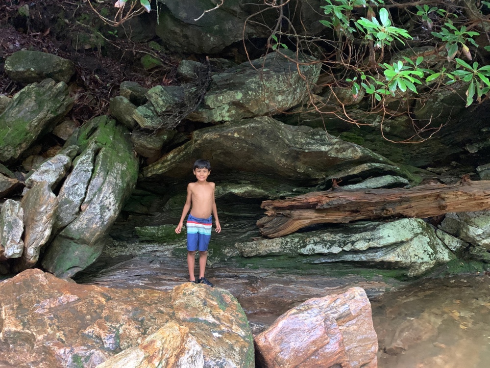 We found a spot at Looking Glass Rock, changed into swim suits, water shoes, and rain jackets. Yes there was a light rain falling as we headed to a swimming hole. Then we hiked the muddy rock and root filled path to Skinny Dip Falls. Not sure who would skinny dip in this semi busy cold mountain water but we had a couple brave souls take a dip. Others climbed on the rocks avoiding the water but having fun just the same.