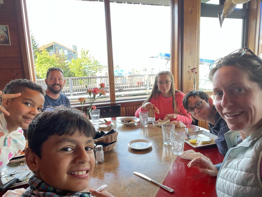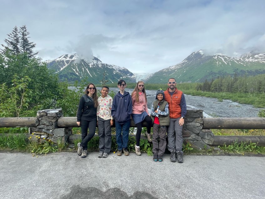 The drive to Exit Glacier was as beautiful as all the others here. Everywhere is green, lush, and the backdrop of snow covered mountains makes every view amazing. We took our first full family picture at the first sight of the blue glacier.
